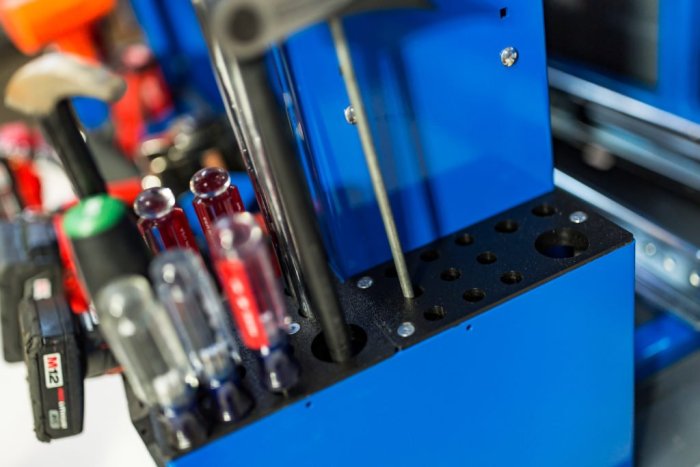 Each tool has a suitable location for its home. The clever layout makes full use of every square centimeter. The sturdy handle is great for your grip, so you can easily turn it from one project to another in a busy workshop.